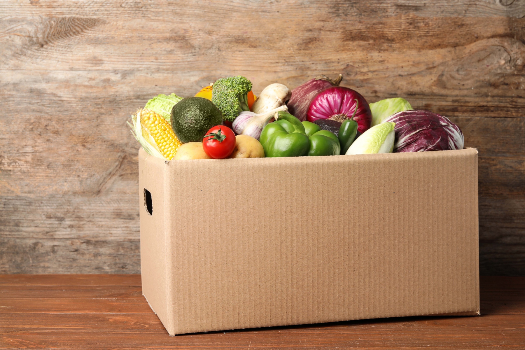 Restaurant worker slips, falls on wet kitchen floor covered in spilled ingredients. Water splashes around worker. Spilled tomatoes food items scattered around worker. Accident scene demonstrates Fresh vegetables in cardboard box on wooden table
