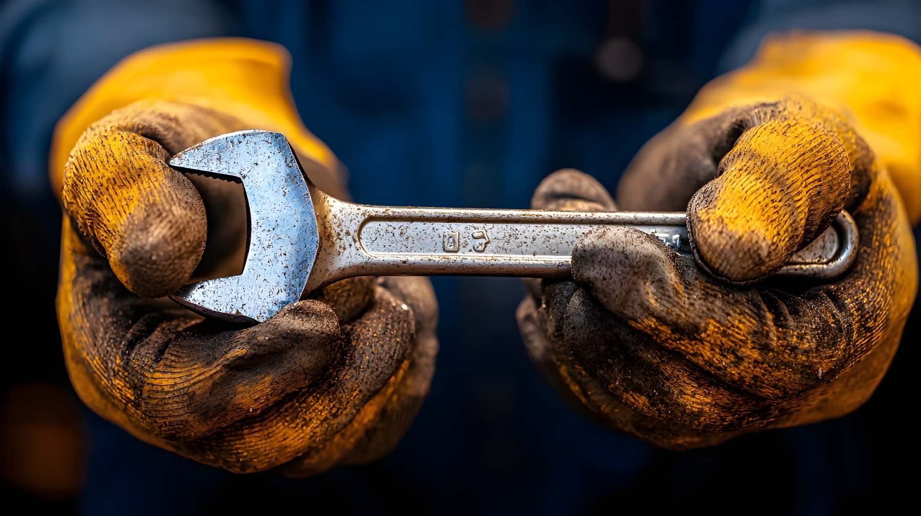 Greasy hands of a mechanic tightening a bolt on an engine block, vivid oil stains on worn gloves, detailed wrench in hand, industrial garage background