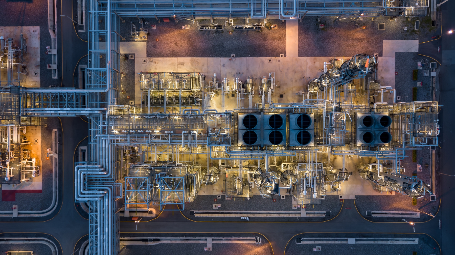 Aerial view power plant for oil refinery petrochemical industrial, Oil refinery factory power plant at night and pipeline steel, Oil refinery factory and power plant.