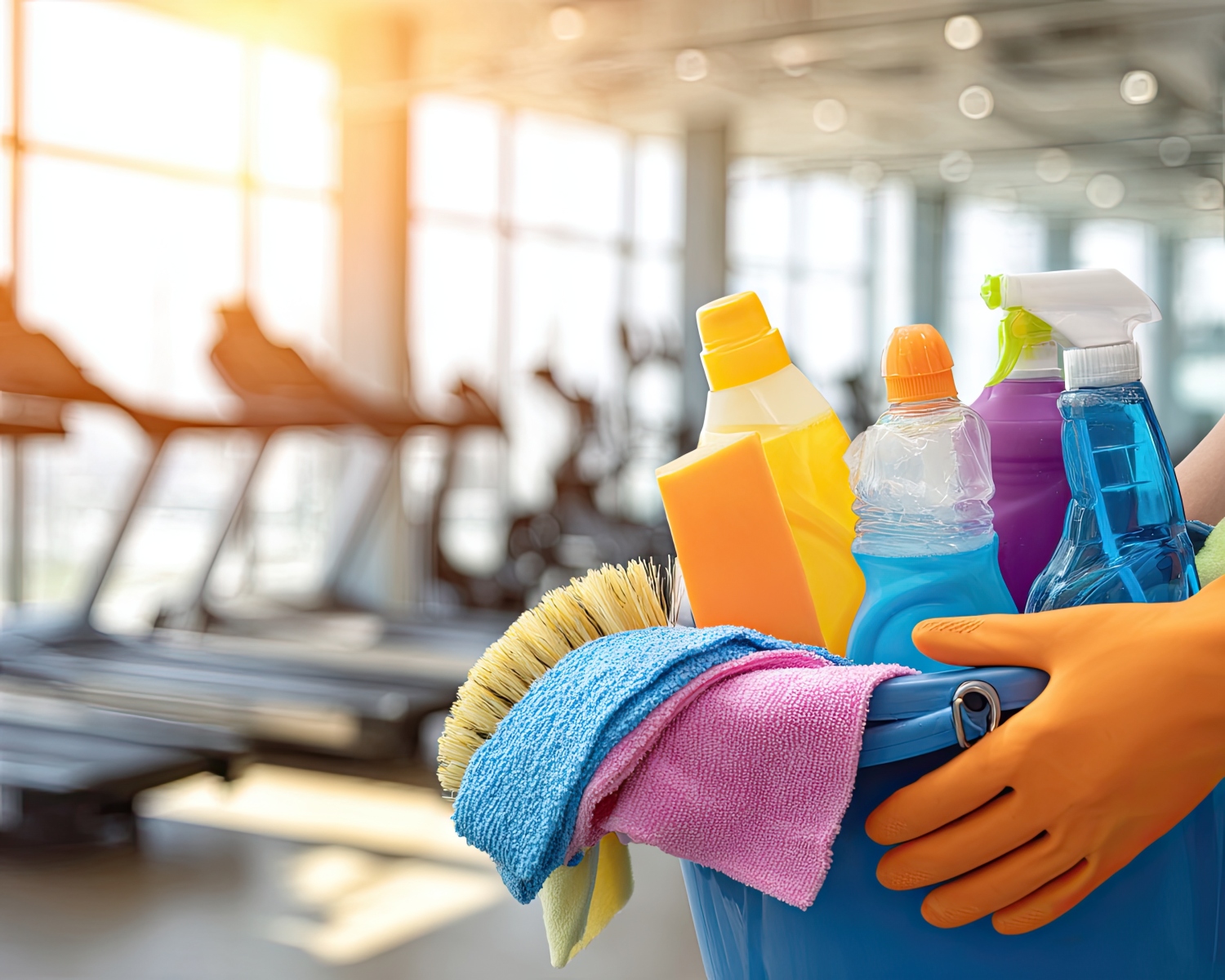 Cleaning Supplies In Gym With Orange Gloves Close up of male athlete getting ready to start running on track . Focus on sneakers