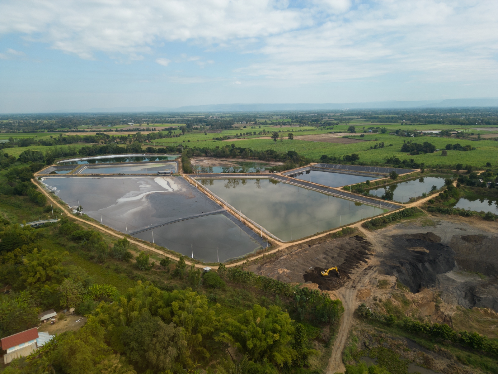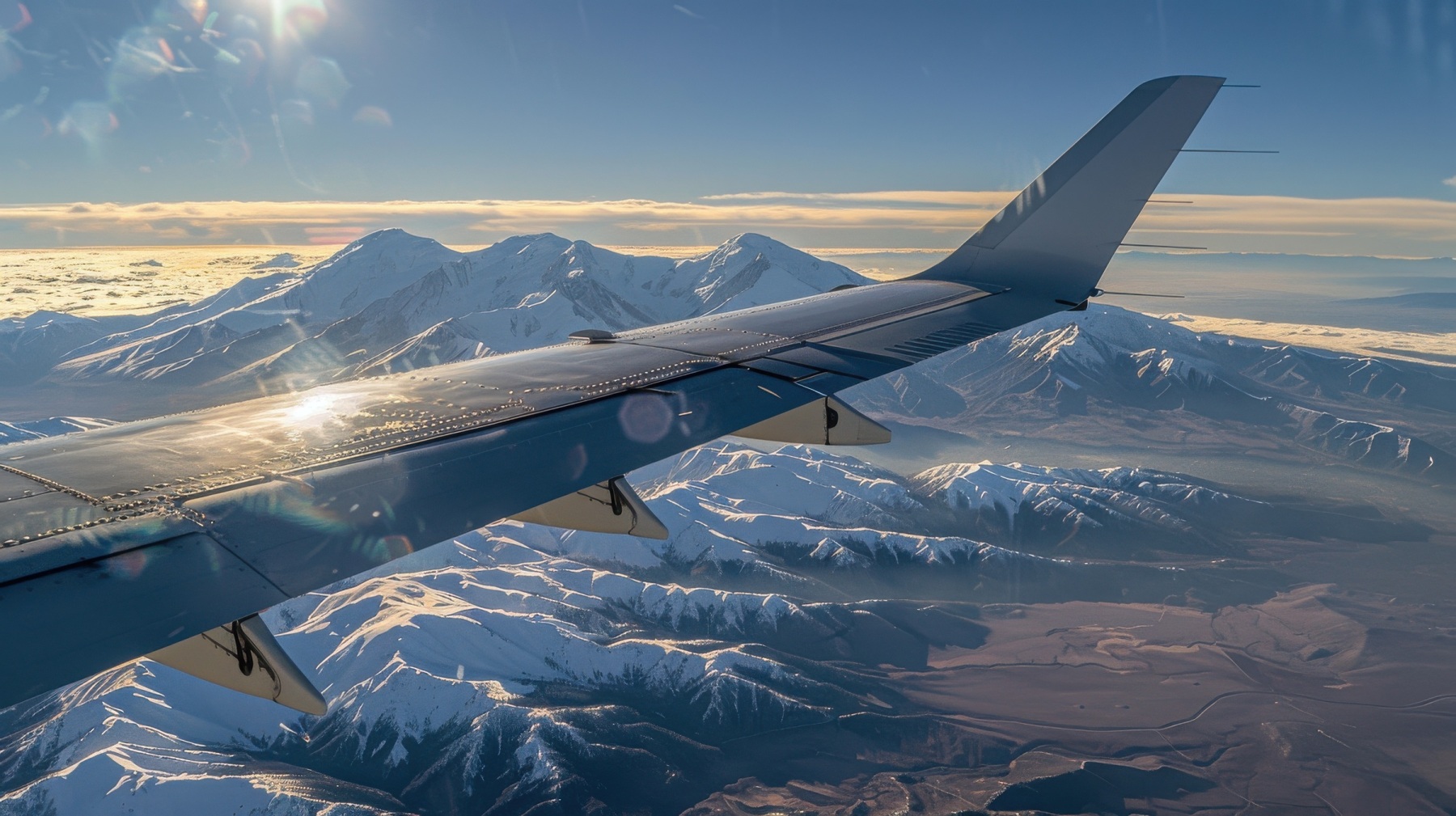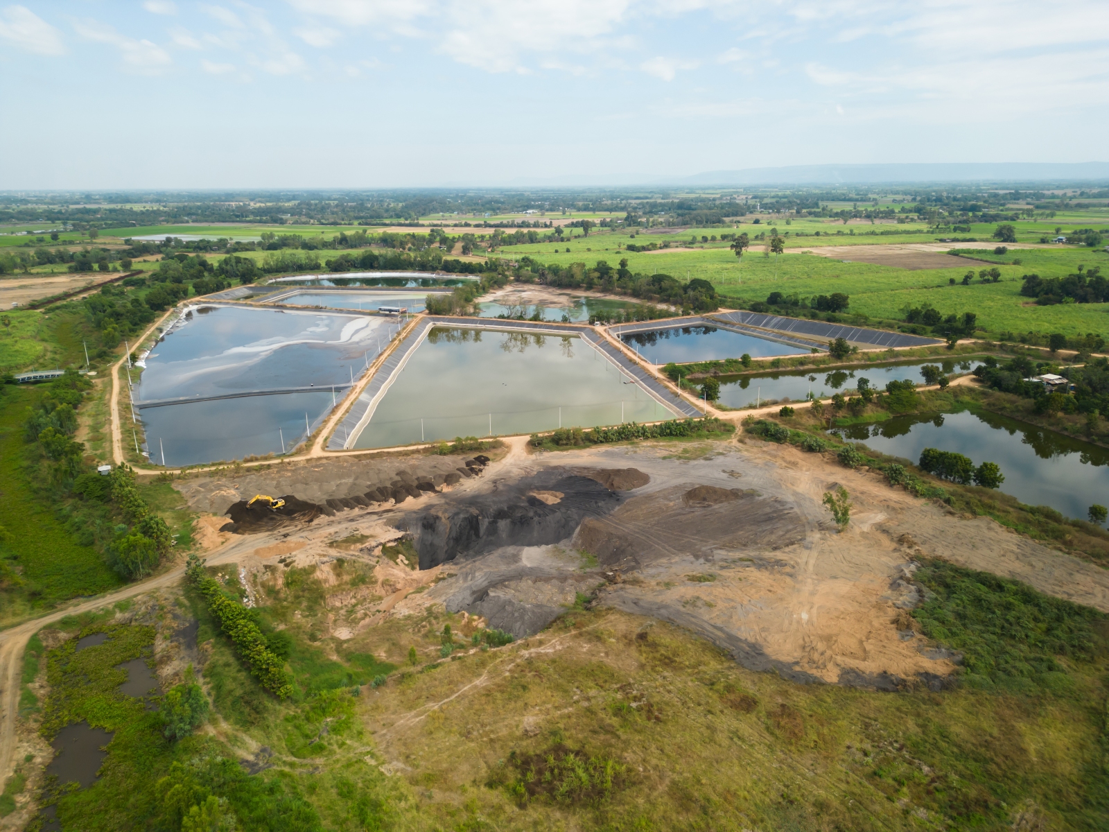 Aerial photography of a large wastewater treatment ponds from industrial plants Aerial photography of a large wastewater treatment ponds from industrial plants Snow-capped peaks meet a clear blue sky as sunlight dances on the aircraft wing, thin clouds blur the horizon.