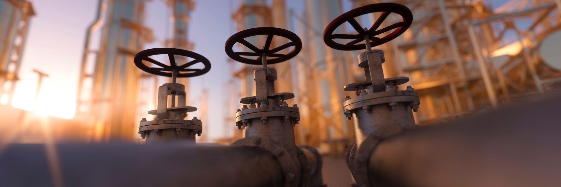 Large industrial gas pipelines in a modern refinery at sunrise 3d render