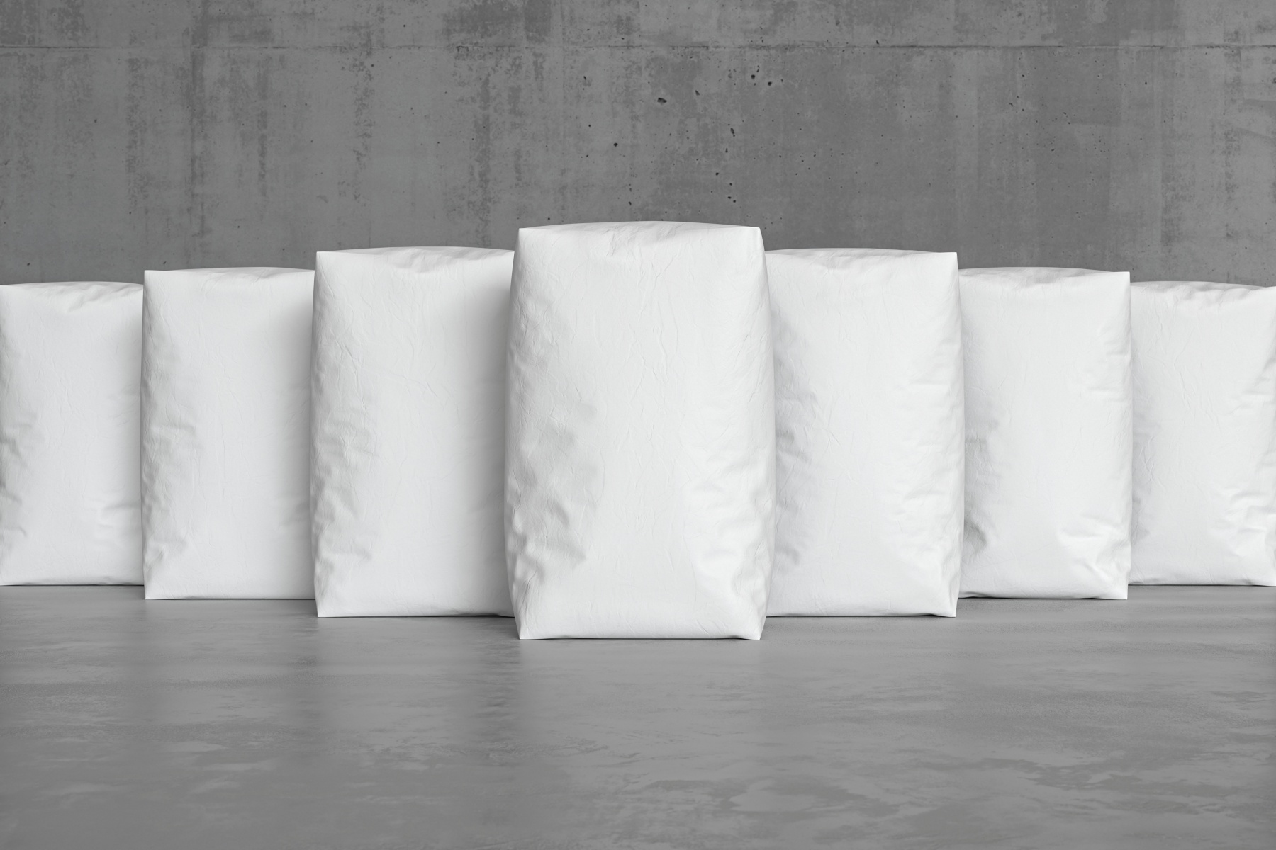 White sacks on the concrete floor. Front view. 3d render