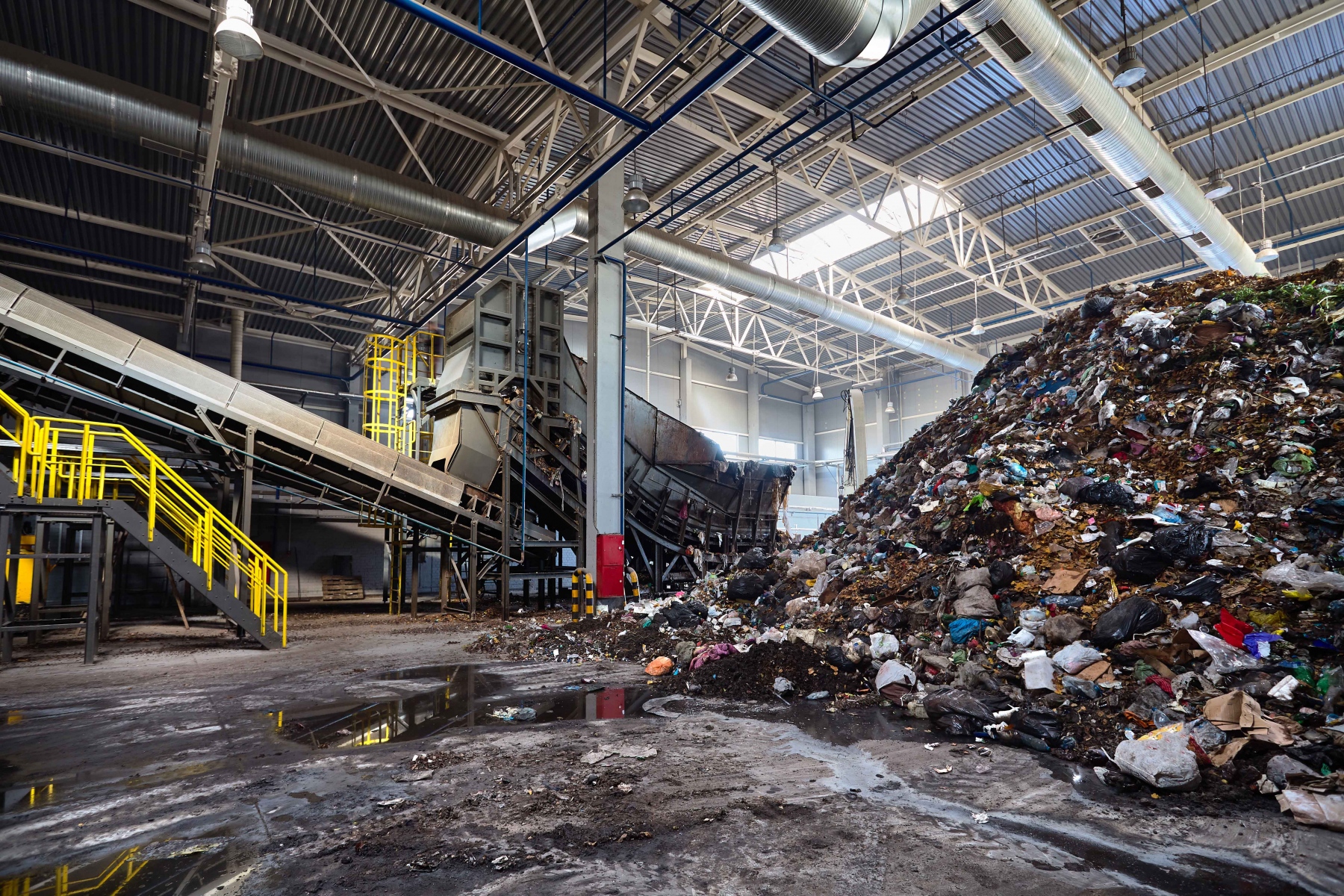 GRODNO, BELARUS - OCTOBER 2018: Solving problem of environmental pollution with waste as garbage processing plant - huge pile of garbage prepared for loading onto conveyor belt for further sorting and processing.