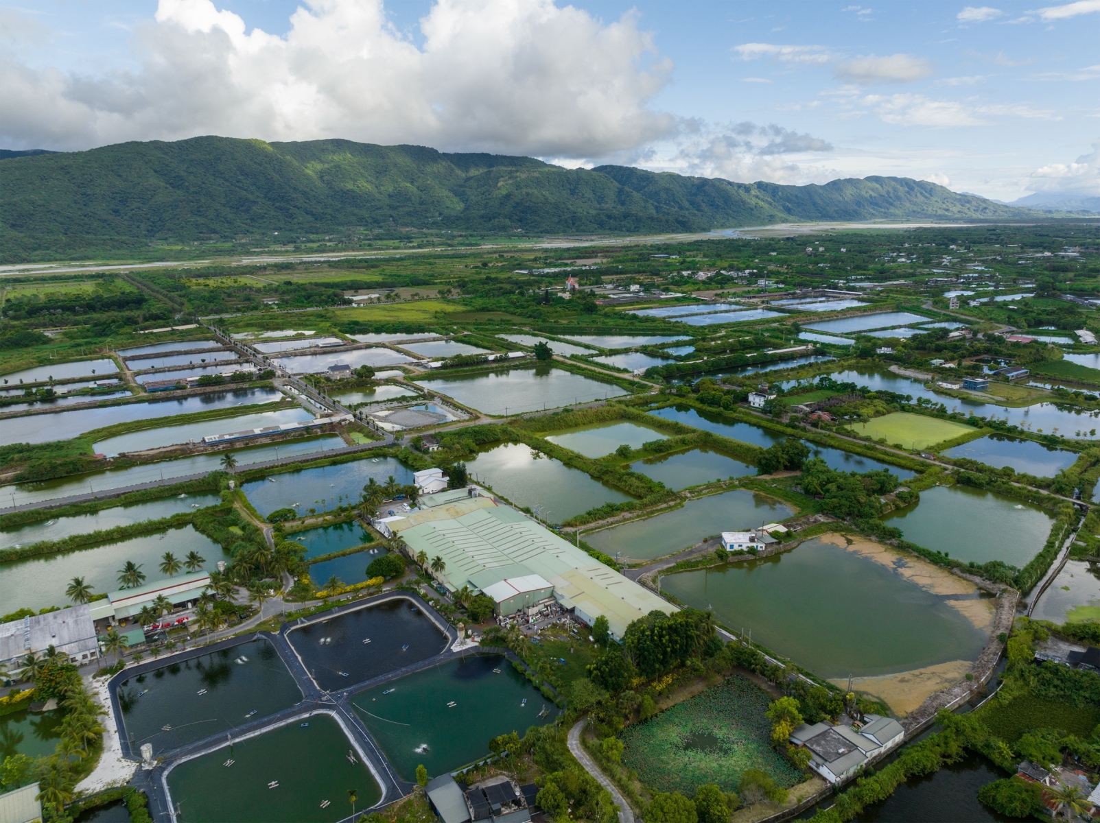 Aerial view of shrimp farm and air purifier in Thailand. Continuous growing aquaculture business is exported to the international market.