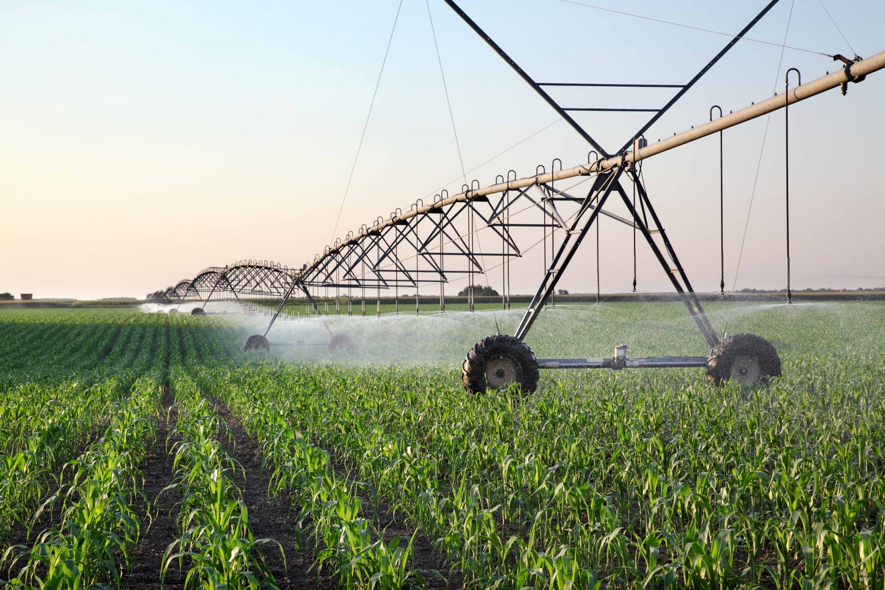 Automated farming irrigation sprinklers system on cultivated agricultural landscape field in sunset