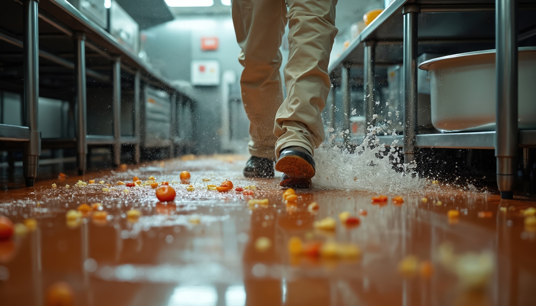 Restaurant worker slips, falls on wet kitchen floor covered in spilled ingredients. Water splashes around worker. Spilled tomatoes food items scattered around worker. Accident scene demonstrates