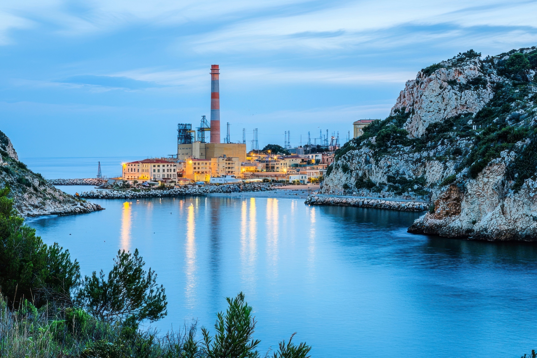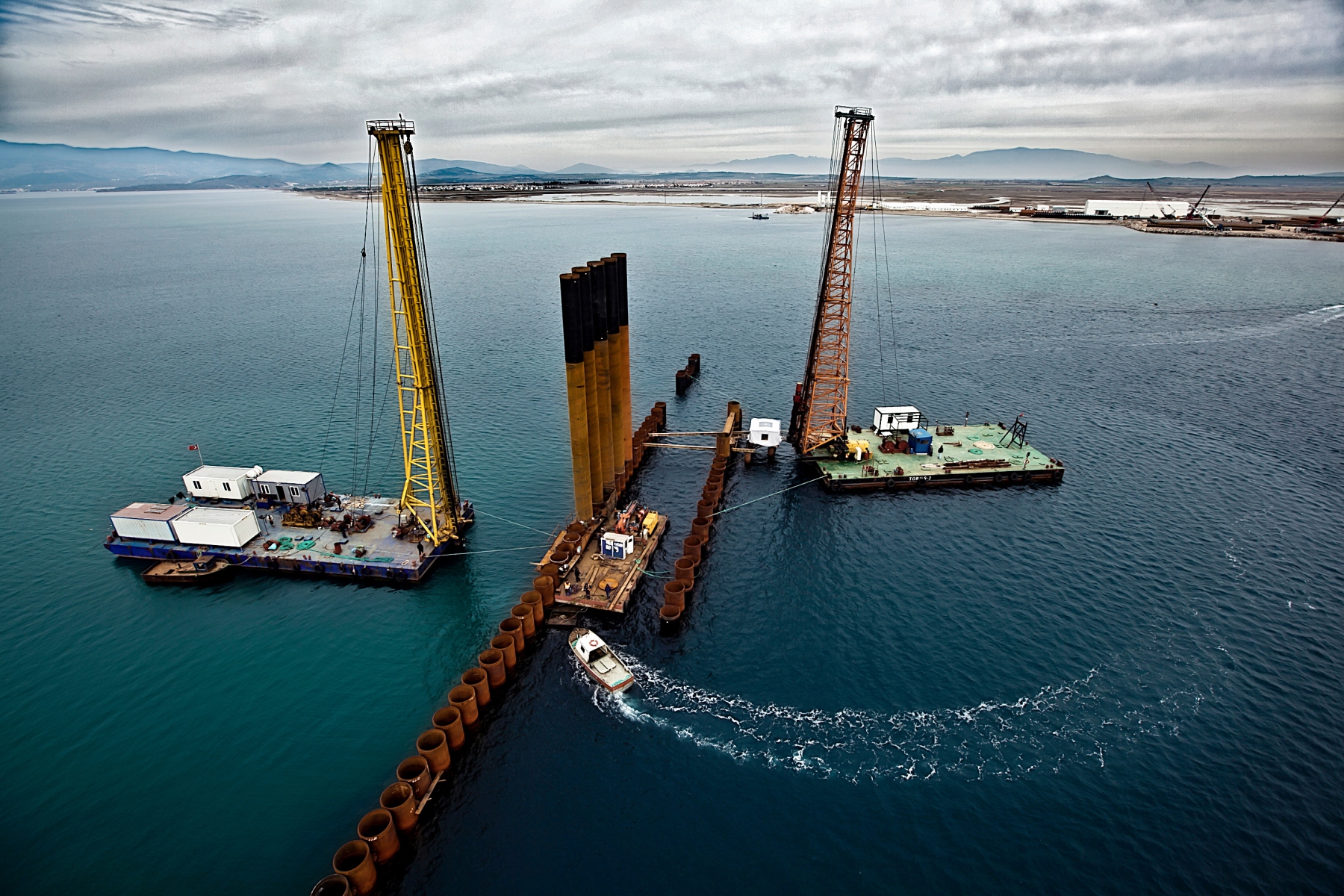 Oil offshore platform in the sea. Extraction of oil on the shelf.