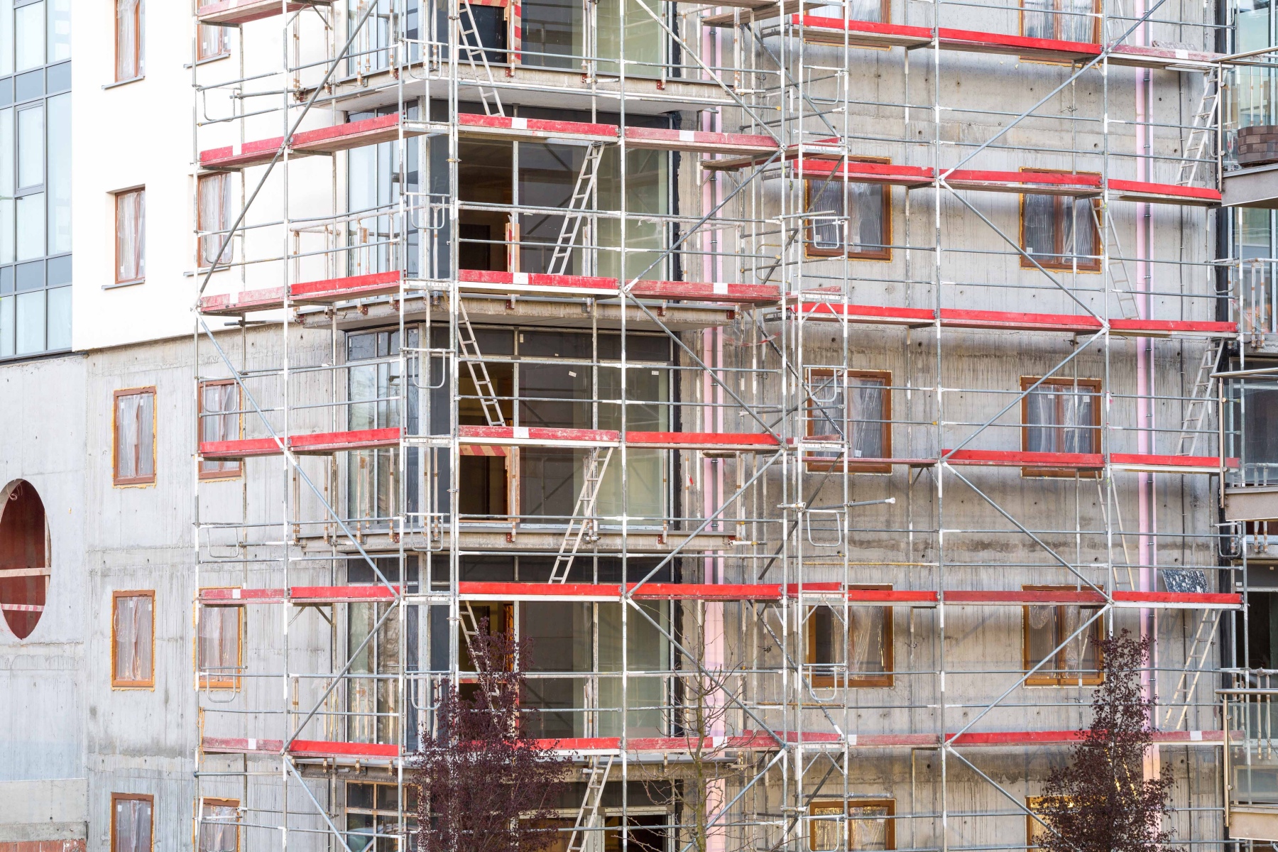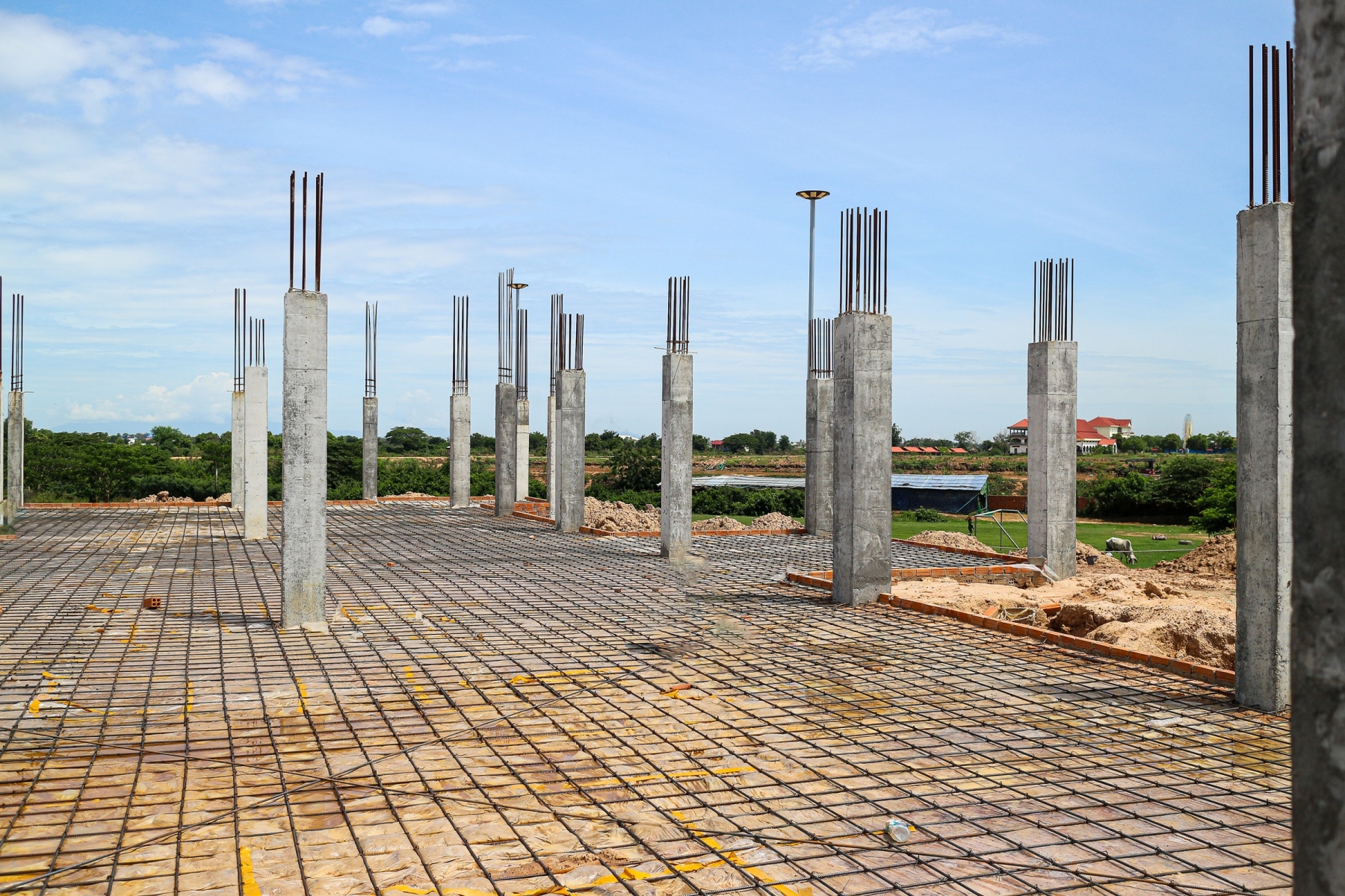 A construction site with concrete columns and reinforcing steel bars, showing the framework for a new building project. Concrete pillars and a steel mesh floor await the next stage of construction.