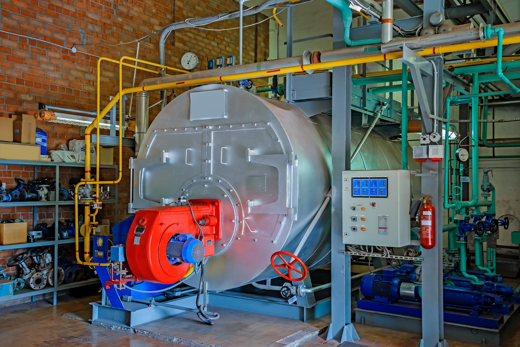 Modern industrial gas boiler room equiped for heating process. Heating gas boilers, pipelines, valves. Sun flares