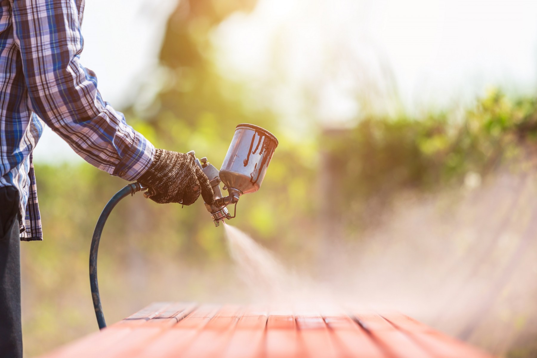 Worker painting steel tube with paint brush selective focus on hand