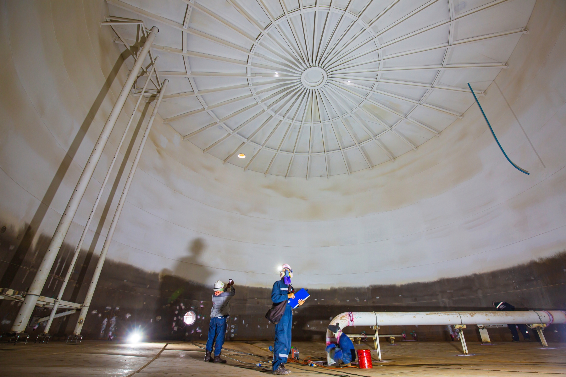 Male worker inspection visual record draft tank oil bottom steel weld with spot lighting internal confined specs underground mining truck vehicle lights equipment gold coal Empty parking deck with ramp in parking building