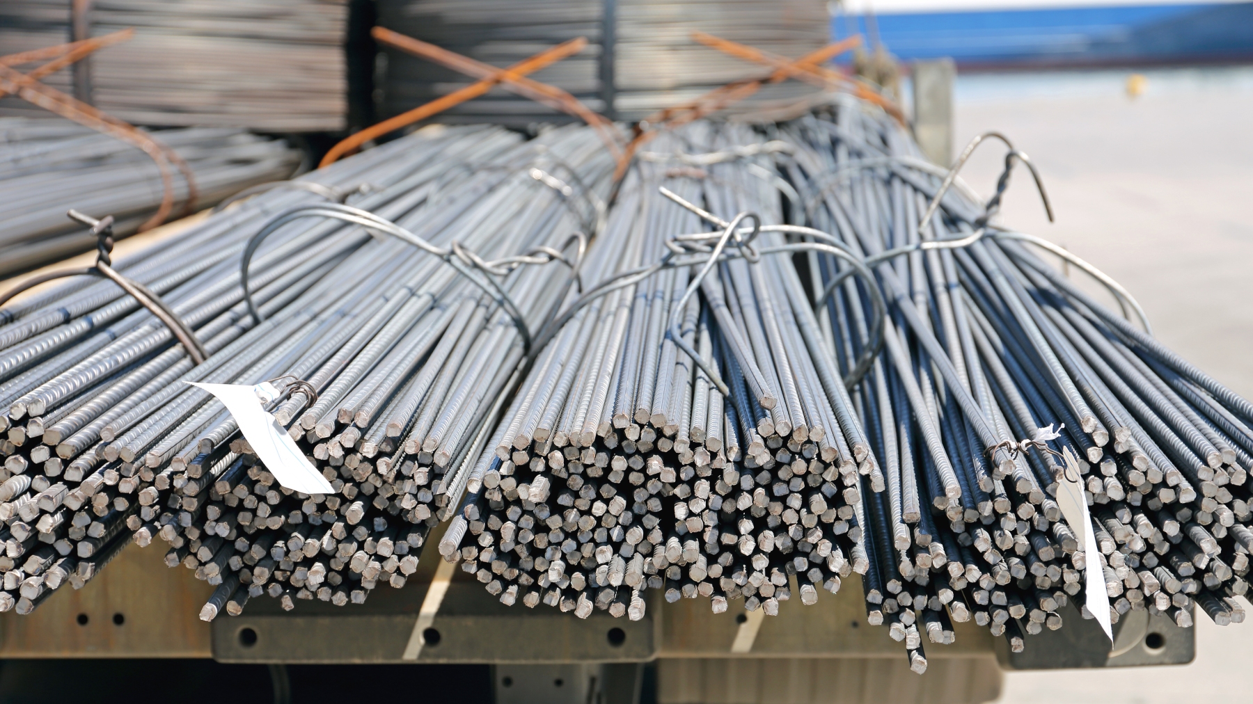 Rebar Rods at Flatbed Truck Trailer Delivery closeup hand of worker plastering cement at wall for building house